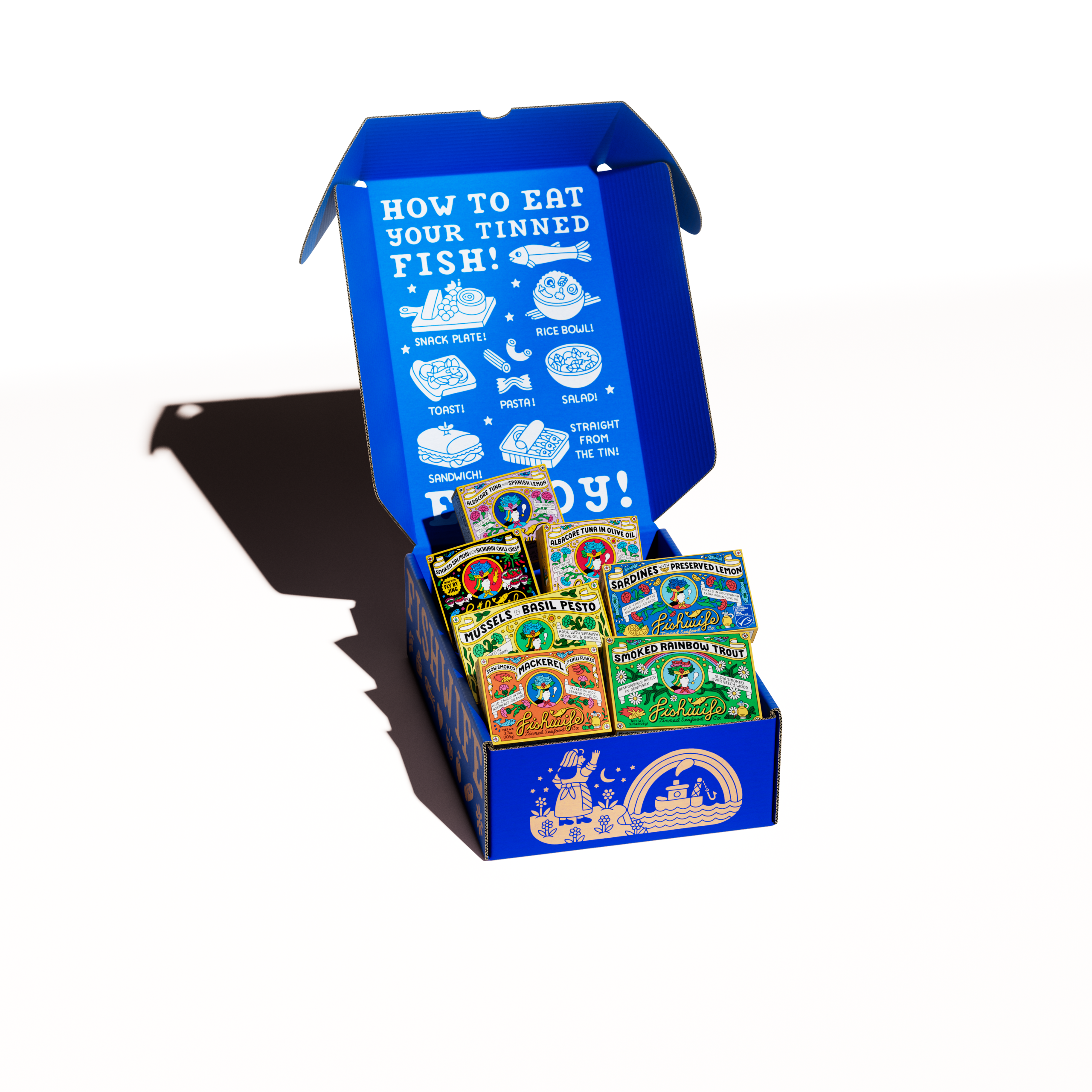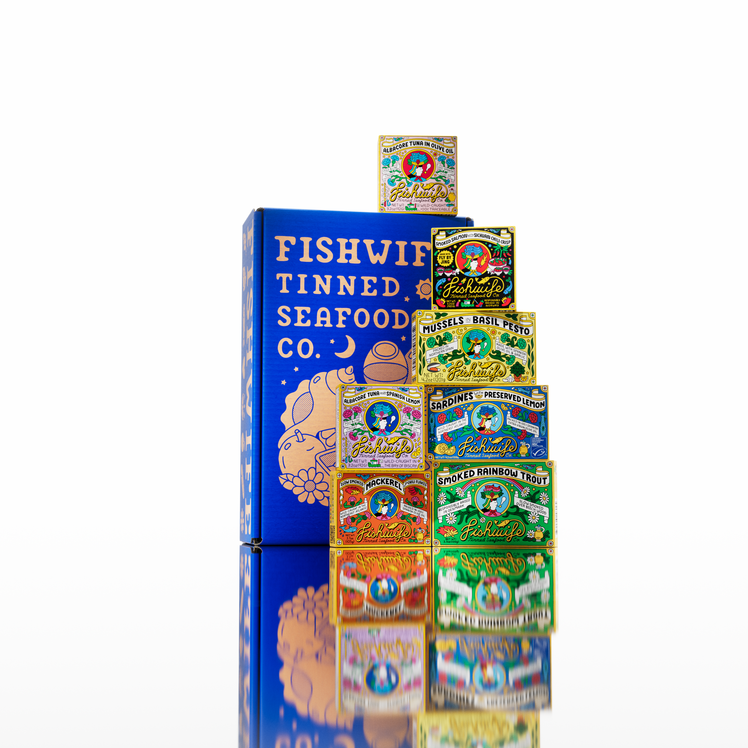 The set includes 1 tin each of Smoked Salmon with Fly By Jing Sichuan Chili Oil. Smoked Rainbow Trout. Smoked Mackerel with Chili Flakes. Albacore Tuna in Olive Oil. Albacore Tuna with Spanish Lemon. Sardines with Preserved Lemon. Mussels in Basil Pesto